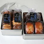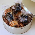rectangle gift tins that include 2 dozen assorted artisan cookies, 6 brownies, and 2 mini loaf cakes